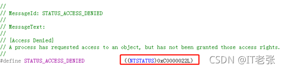 2、查找到异常值0xc0000022对应的标识STATUS_ACCESS_DENIED