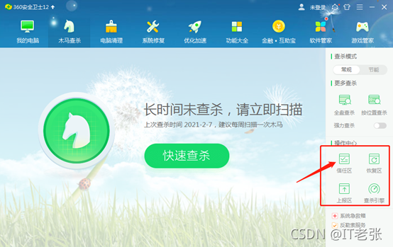难道是360觉得该文件可能包含病毒,将该文件隔离了,禁止访问了?于是到360安全卫士按照下面的操作步骤查看拦截记录。先点击主页面上方的“木马查杀”按钮,进入如下页面: