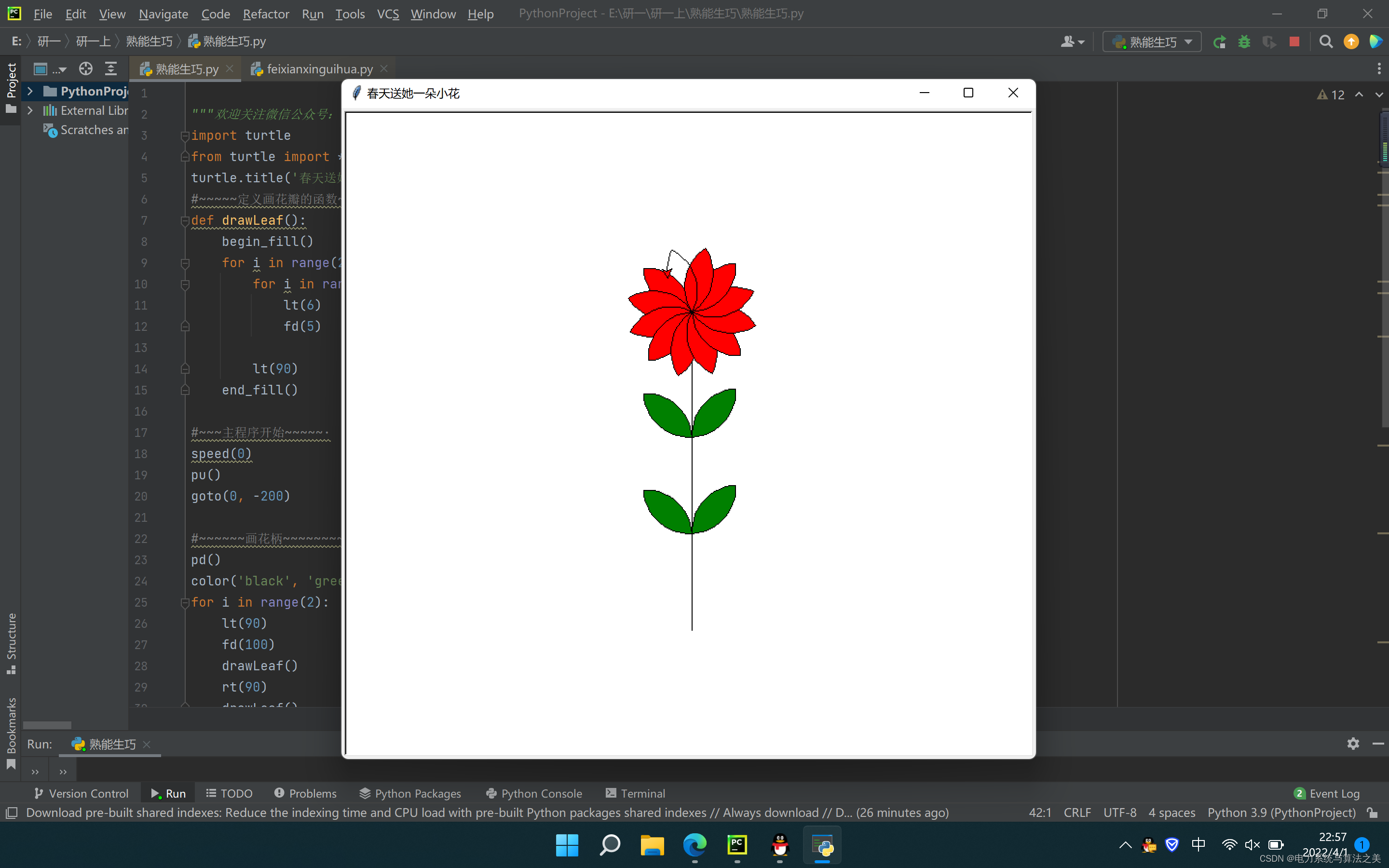 for i in range(2):lt(90)fd(100)drawLeaf()rt(90)drawLeaf()#~~~画花朵~~~~~