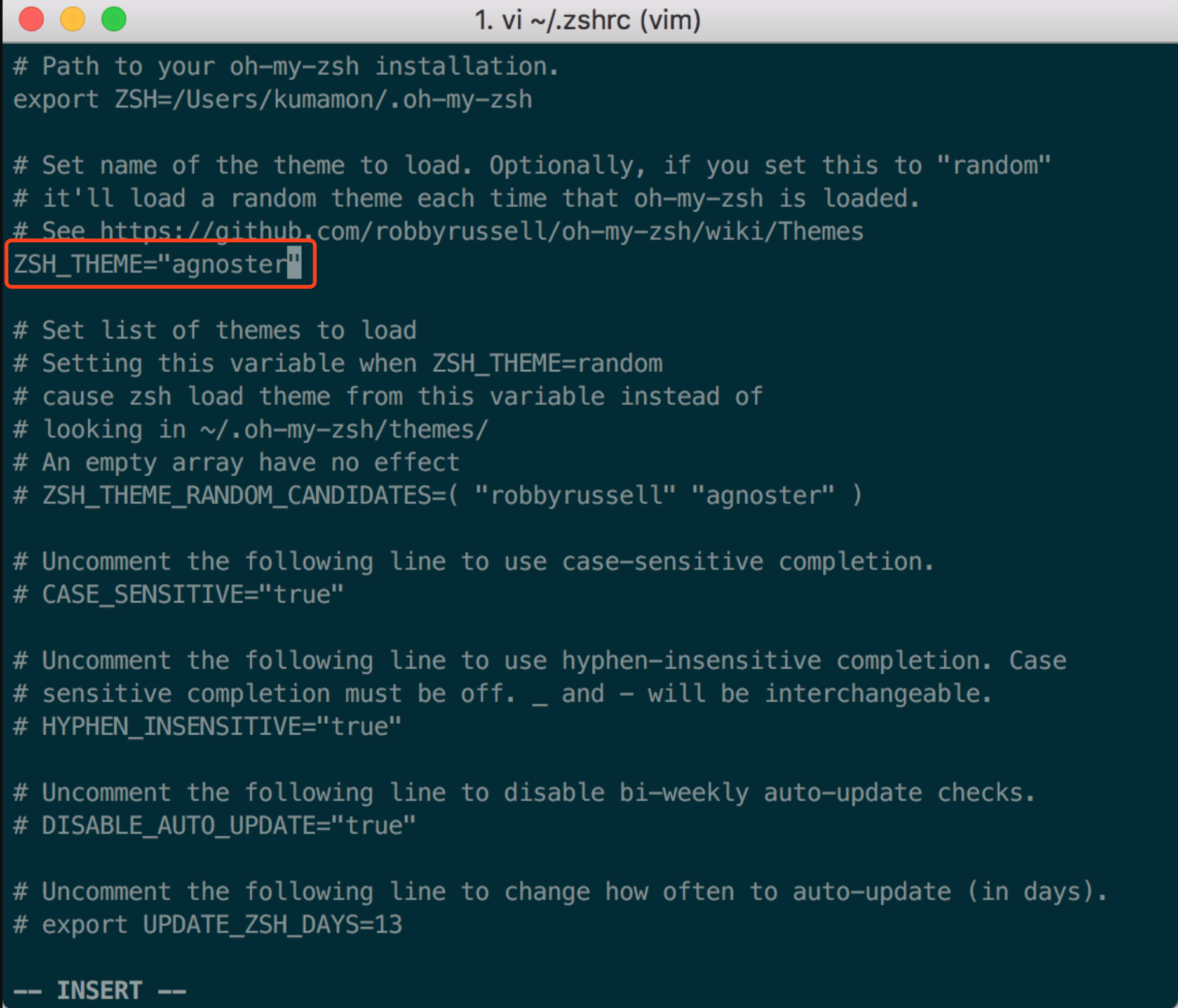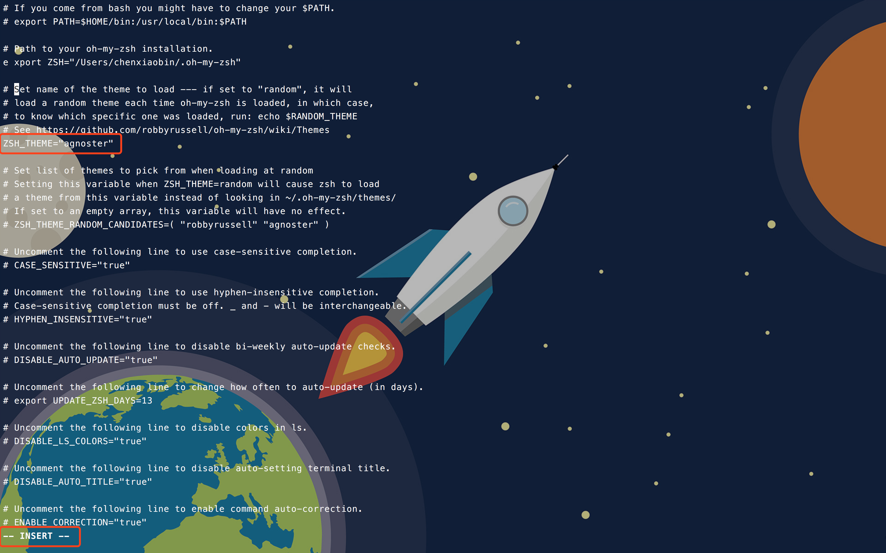 执行命令打开zshrc配置文件,将ZSH_THEME后面的字段改为agnoster