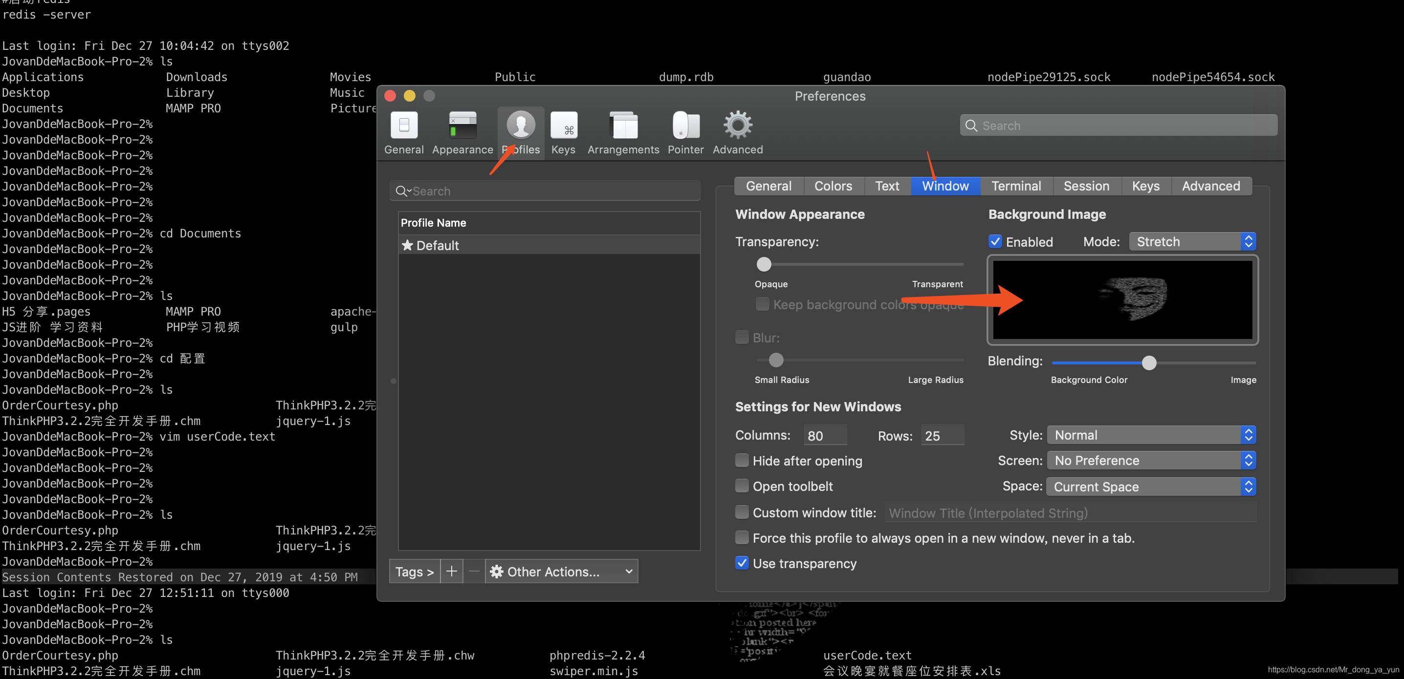 2.iterm2---->PreFerences-->Profiles-->window-->Backgound image(双击替换)