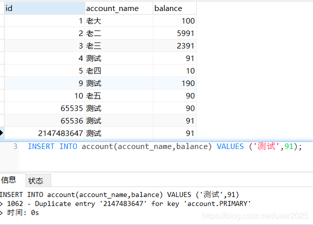 MySQL主键当达到最大值(如果为int类型,最大值为21亿多),此时再插入数据,会提示主键重复错误。