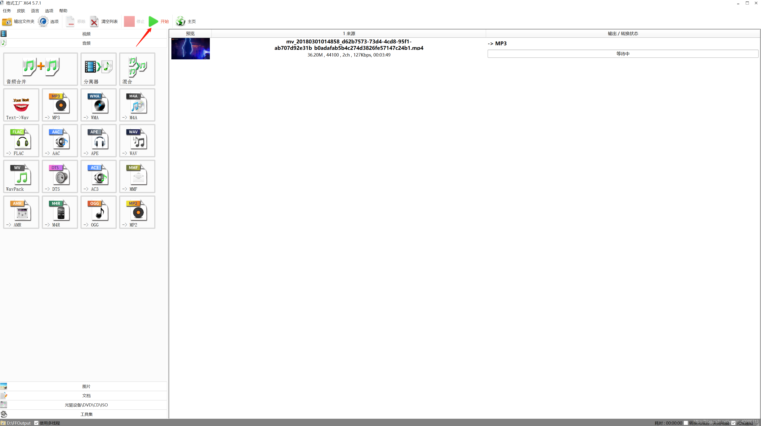 5.点击确定后,文件显示等待中,点击下图的【开始】按钮,进行转化。