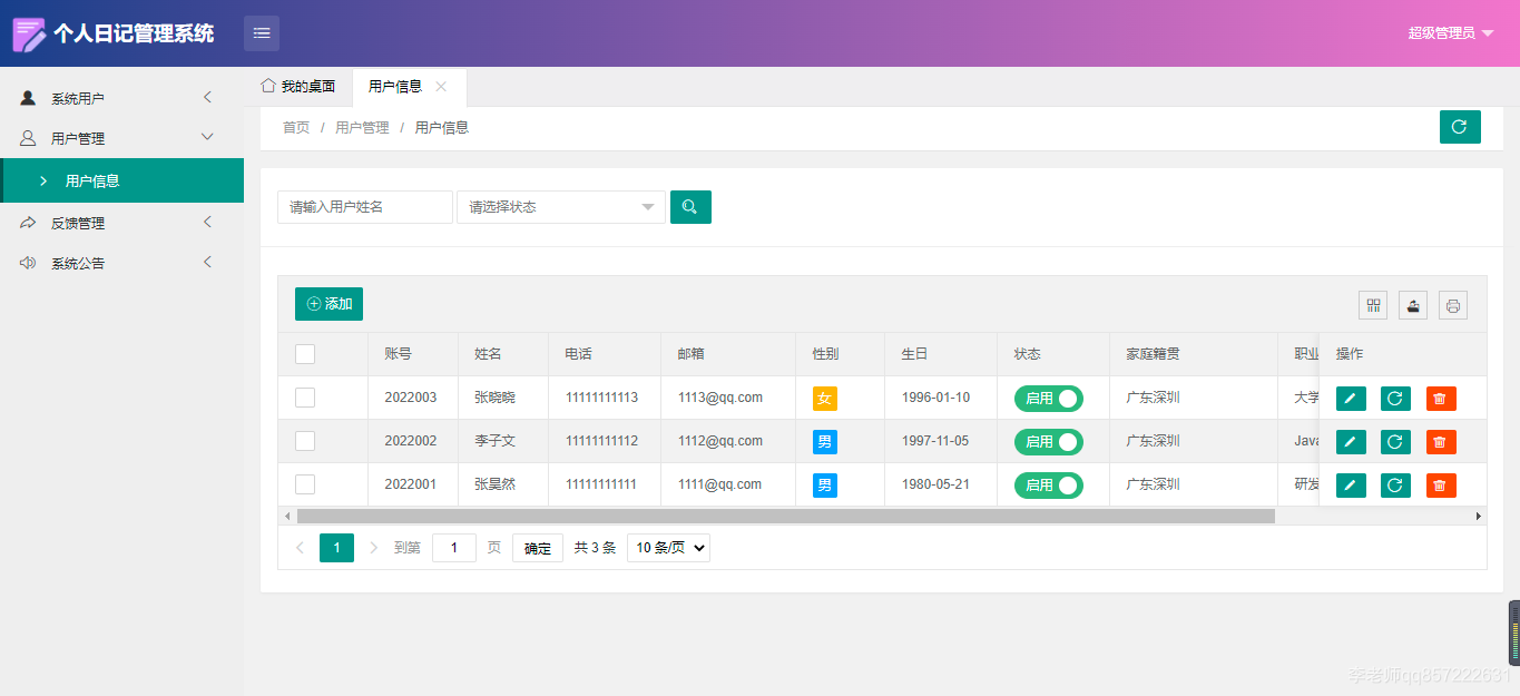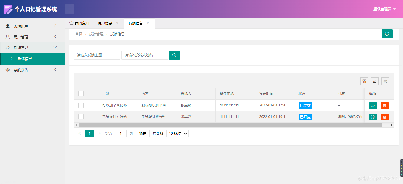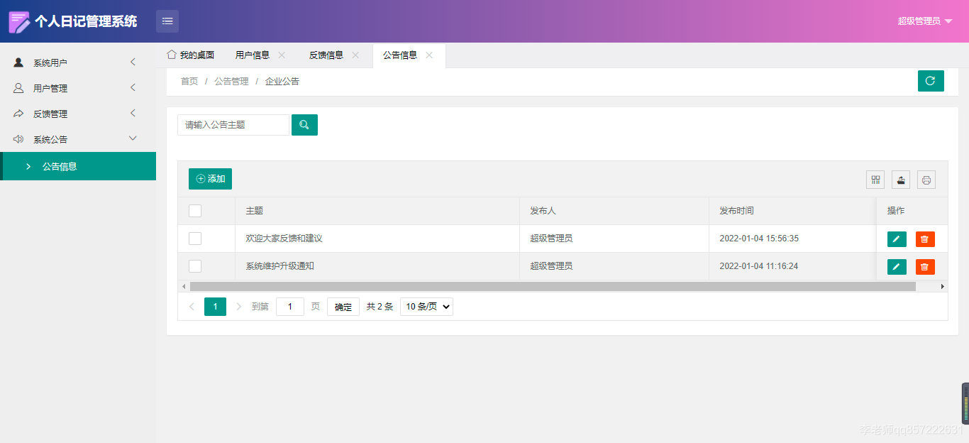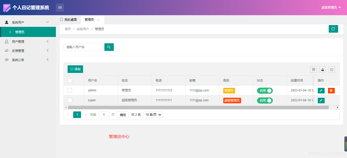 使用java+springboot+mysql开发的个人日记管理系统,系统包含超级管理员、管理员、用户角色,功能如下: