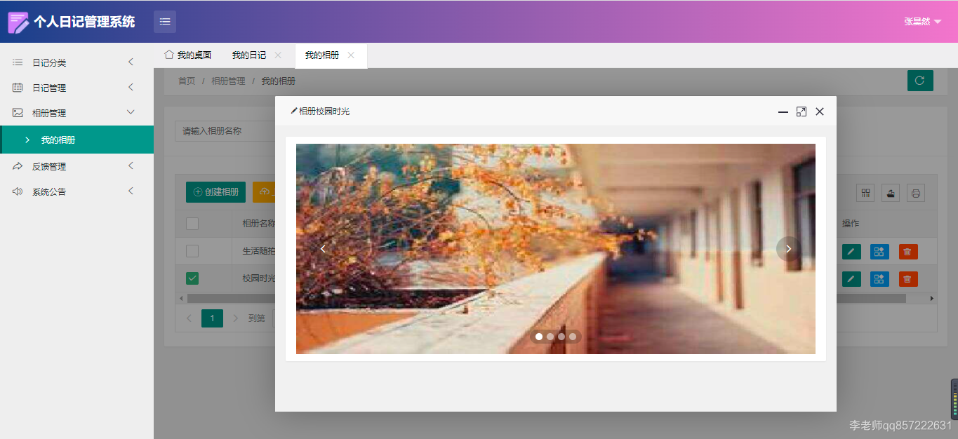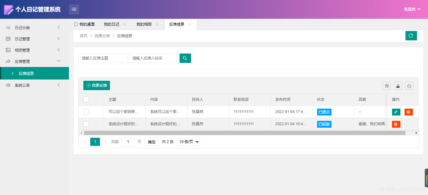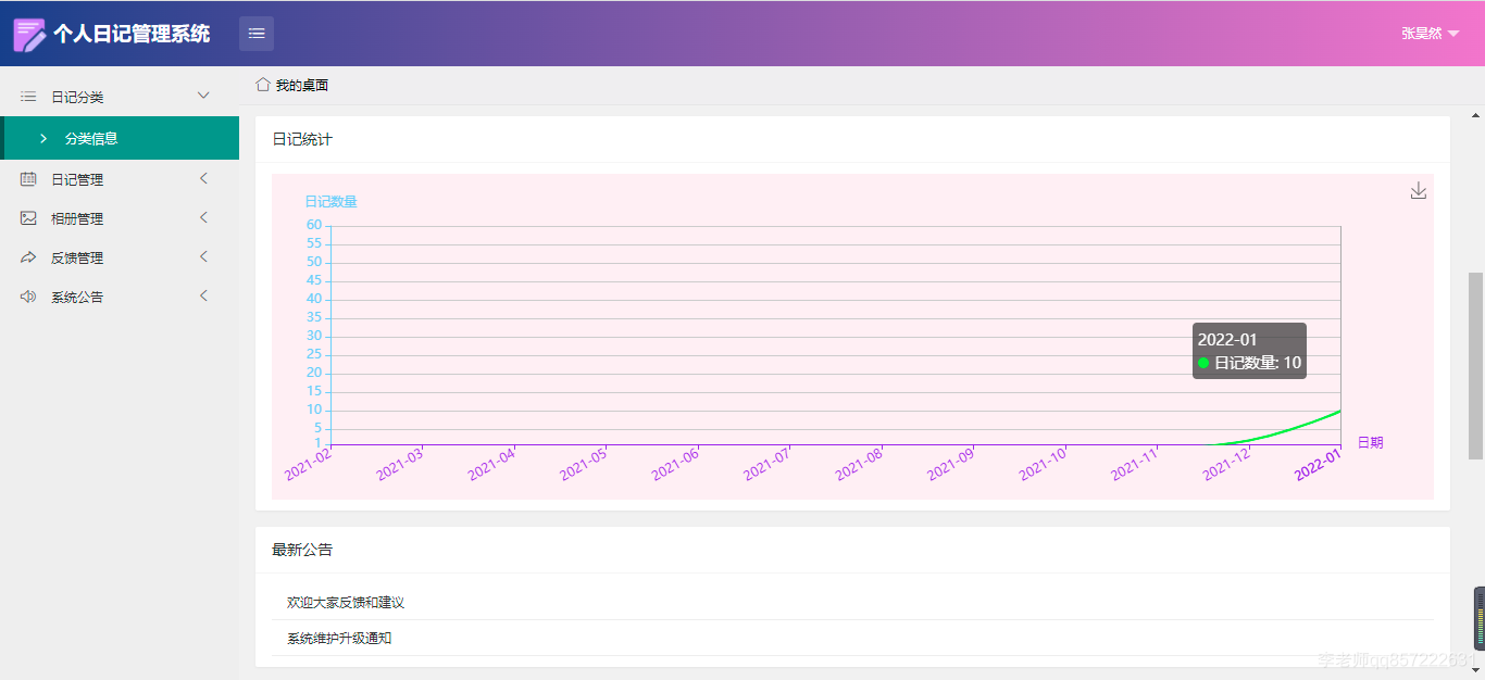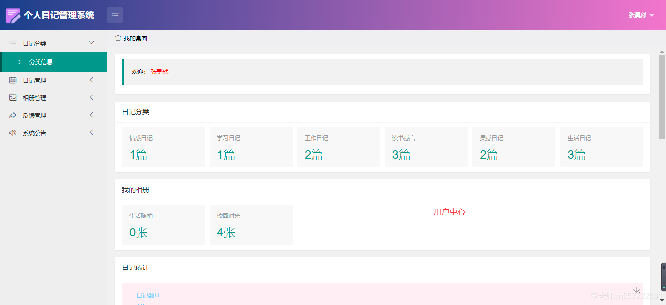 用户:注册、登录;日记分类;日记管理;相册管理(批量上传照片);反馈管理;系统公告;修改个人信息;修改密码;日记统计;相册统计;