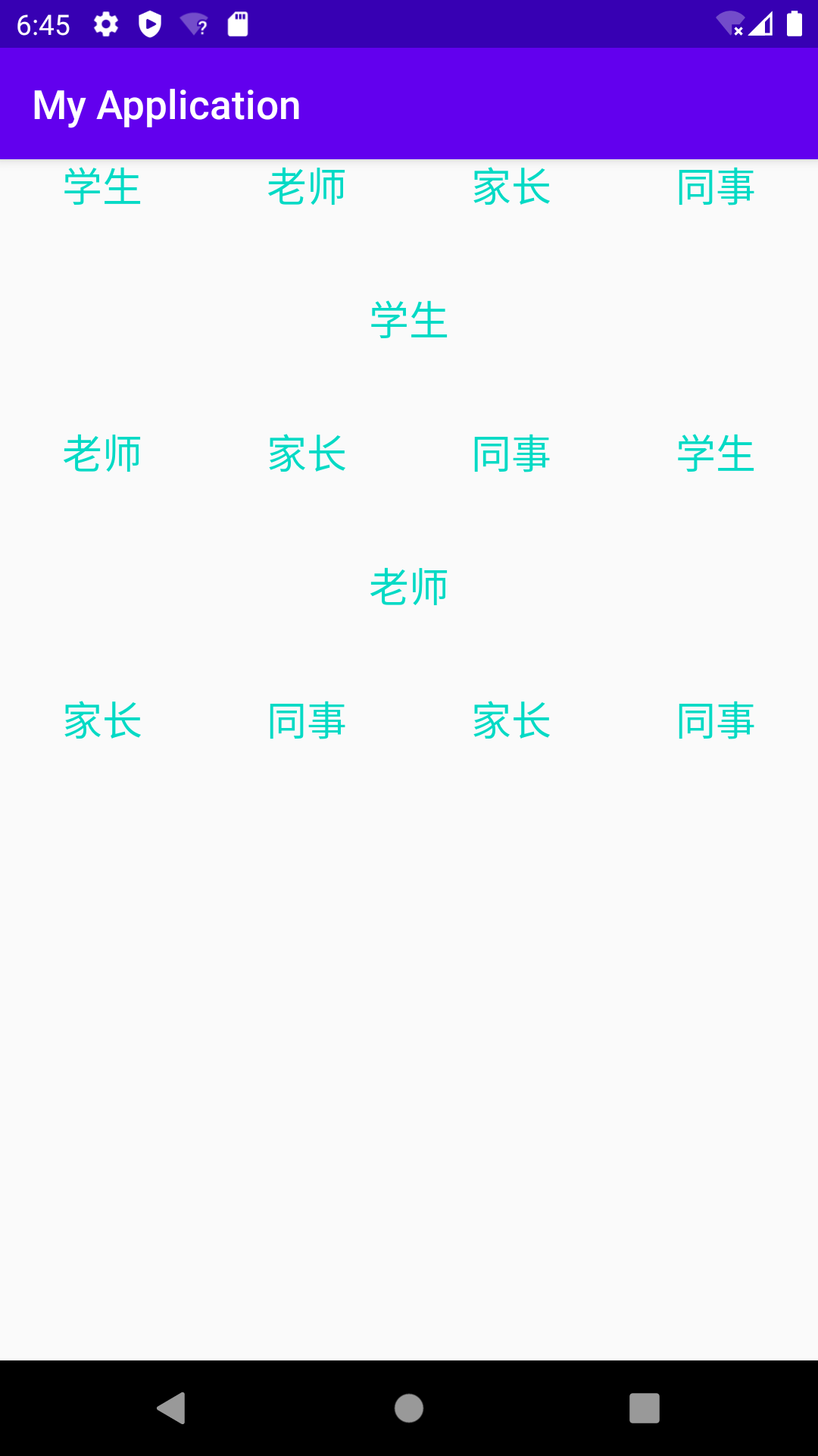 mRecyclerView=findViewById(R.id.activity_rv);mRecyclerView.setLayoutManager(new LinearLayoutManager(this));List<String> list=new ArrayList<>();list.add("学生");list.add("老师");list.add("家长");list.add("同事");TestAdapter testAdapter=new TestAdapter(list);mRecyclerView.setAdapter(testAdapter);